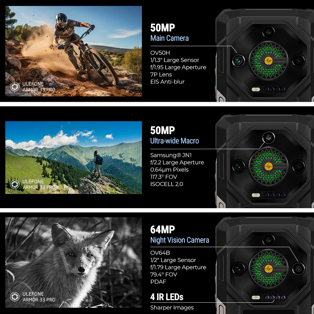 O robusto telefone Ulefone Armor 33 Pro 5G possui uma câmara principal de 50 MP, uma câmara ultra grande angular de 50 MP e uma câmara de visão noturna infravermelha de 64 MP, permitindo-lhe captar todas as suas aventuras. A câmara de selfies de 32 MP garante videochamadas e vlogs impecáveis. Um botão físico dedicado à câmara elimina a necessidade de desbloquear o ecrã. Um toque longo inicia instantaneamente a aplicação da câmara e um toque suave permite captar o momento perfeito.